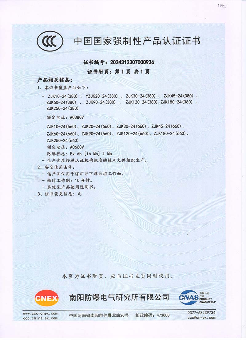 礦用隔爆ZB10-24中國國家強制性產品認證證書110.2